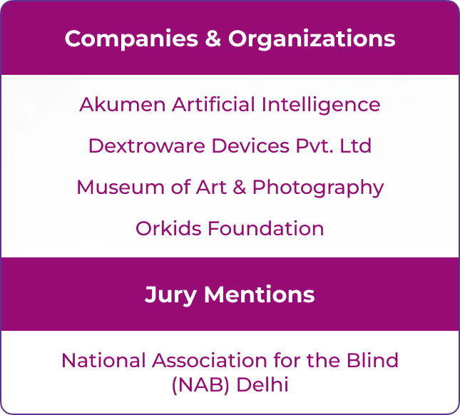 Awards in this category are given to those companies or organizations who have taken up the cause of Accessibility and Universal Design in any of the areas such as built environment, transport infrastructure, service provision, Information and Communication Technology (ICT), universally designed consumer products, mobility & independent living