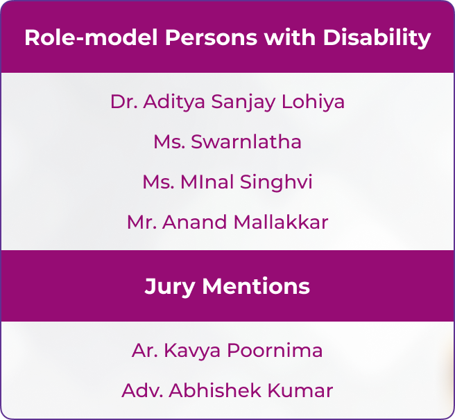 Awards in this category are given to people with disabilities who have created an impact in accessibility and universal design in any of the areas such as built environment, transport infrastructure, service provision, information, and communication technology (ICT), universally designed consumer products, mobility & independent living aids, or assistive technology in their personal/professional capacity.